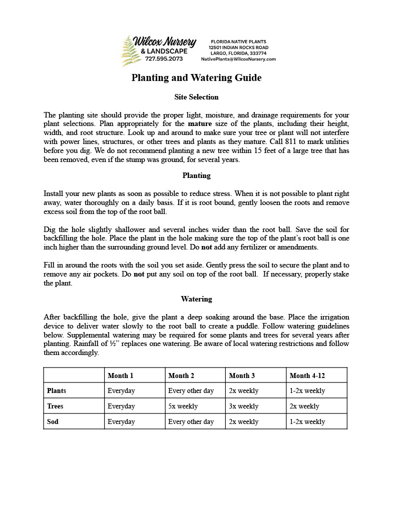 Resource Library Wilcox Planting and Watering Guide PROPER Sabal Palm Pruning Gardening for Birds By Season Bioswale Handout Simple Installation Agreement Native Plants for Bees Milkweed Statement and FAQ's Keystone Trees Butterfly Host Plants for Tampa Bay Salt Tolerant Native Plants Grass Removal Methods The Big Yard Checklist Native Grasses and Groundcovers Wildflowers for Shade Guide for Choosing Native Plants Monarchs and Milkweeds Aquatic Wildflowers for Pollinators Wildflowers for Dry Landscapes